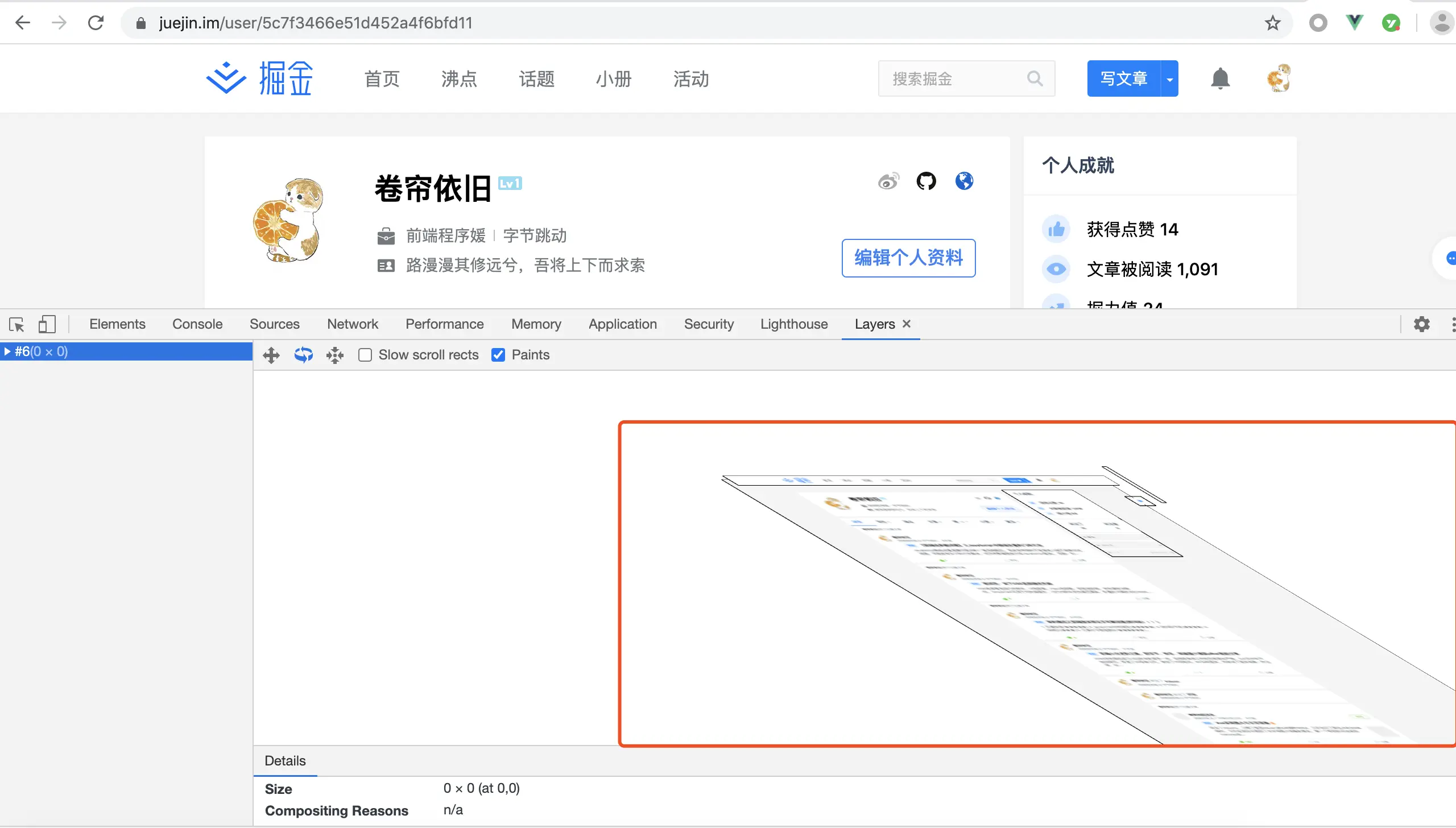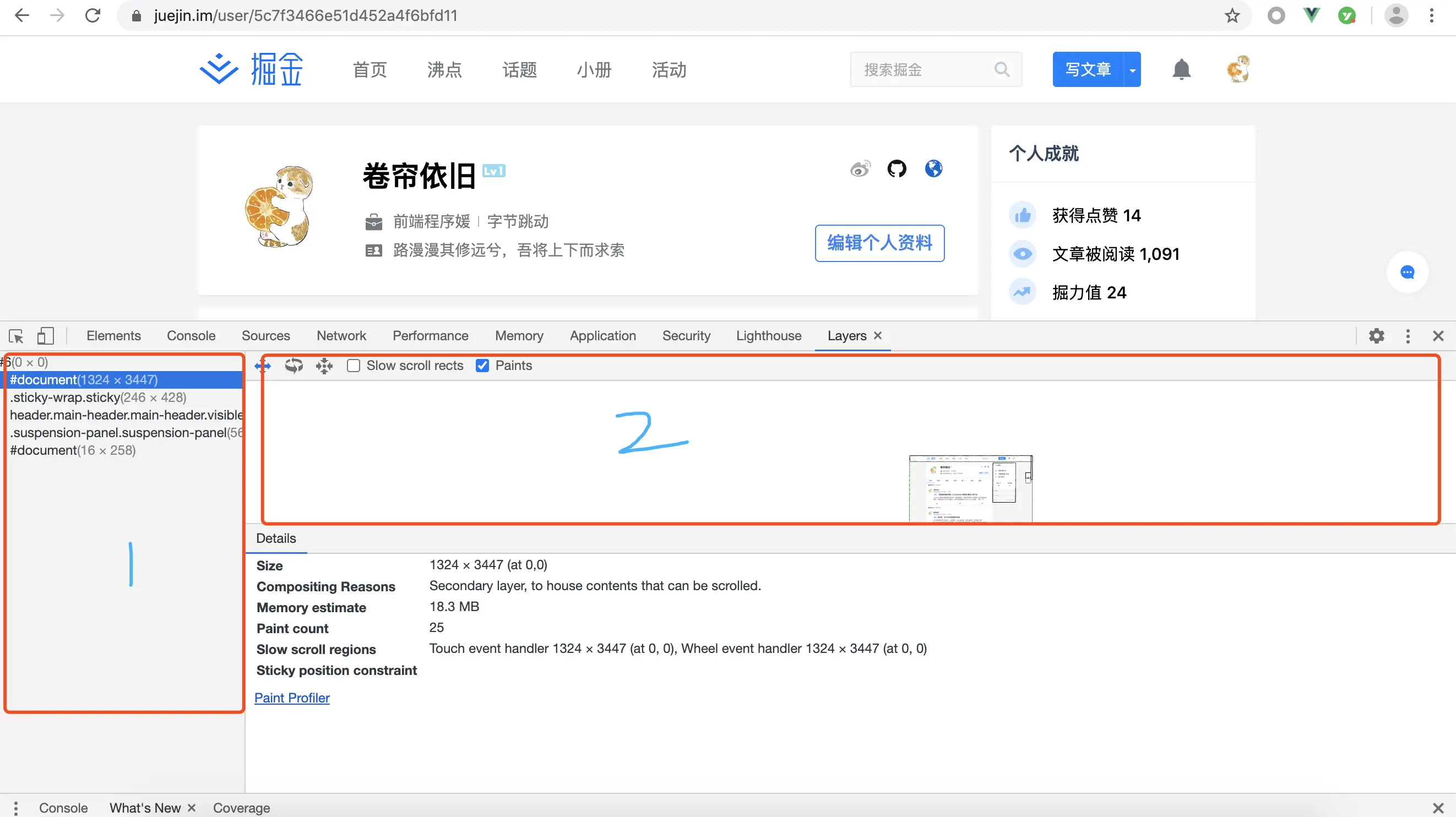 通过 Chrome 的『开发者工具』-> 『Layers』就可以可视化页面的分层情况,如下图所示: