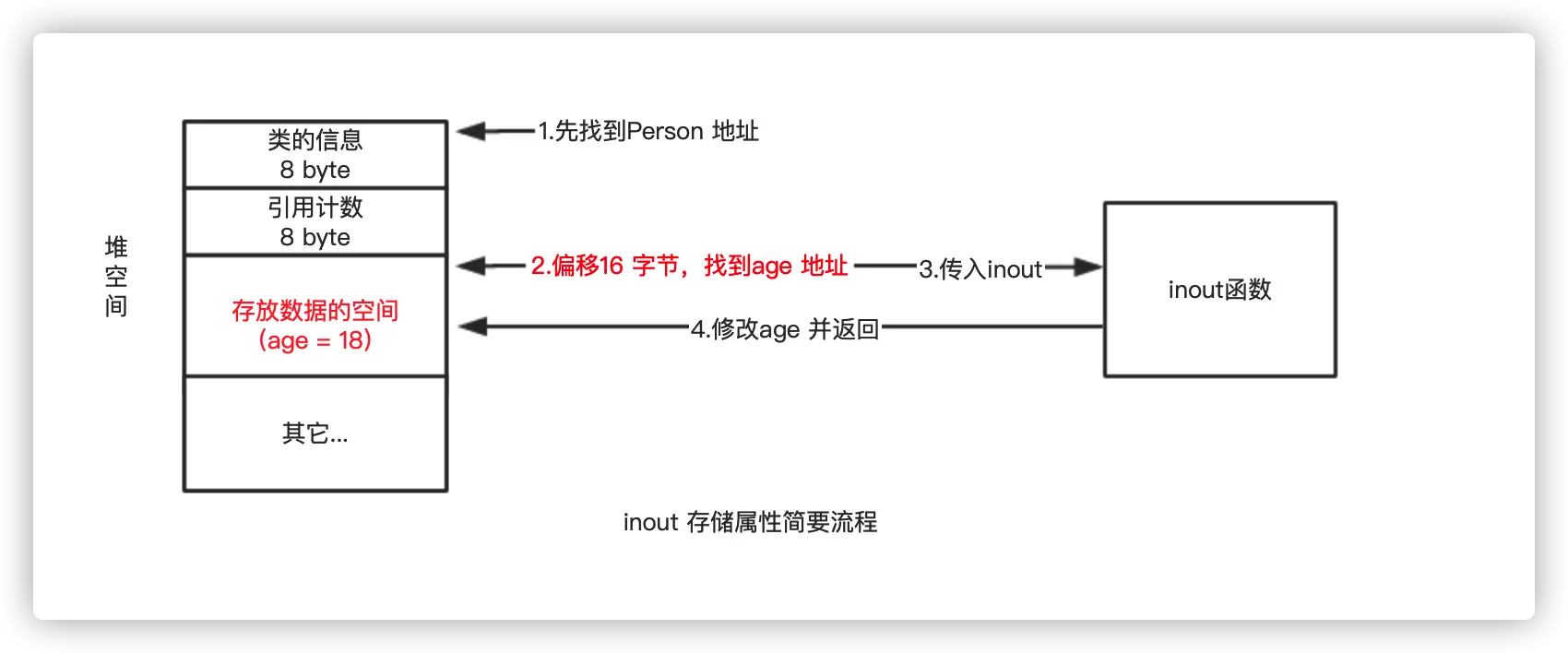 类对象 Class 的存储属性,inout 函数也是通过 改变 age 的内存地址里的值,来改变 age