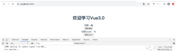 <template> <div id="app"> <h1>{{title.name}}</h1> <div>{{user}}</div> <button @click="updateUser">修改名称</button> <div>当前count:{{computedCount}}</div> <button @click="increment">修改count</button> </div></template><script>import { reactive,ref,onMounted,computed } from 'vue'export default { name: 'App', setup(){ const title = reactive({ name:'欢迎学习Vue3.0' }) const user = ref('河畔一角'); //如果需要修改值,可通过value const updateUser = ()=>{ user.value = '河畔老师' } //生命周期方法 onMounted(()=>{ console.log('init mounted...') }) // 初始化count值 const count = ref(0); const increment = ()=>{ count.value++ } // 调用计算属性函数Hook const computedCount=computed(()=>count.value*10) return { title , user, updateUser,count,increment,computedCount } }}</script><style>#app { text-align: center; color: #2c3e50; margin-top: 60px;}</style>