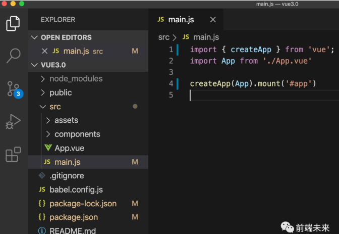 安装完vue-next以后,我们就发现本地项目已经升级到了3.0. 打开main.js如图: