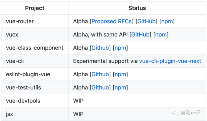 所以,从截图来看,还会经历RC阶段才会有正式版本能用,大家不要过于着急,目前尤大正在全力开发配套基础功能,比如脚手架、vue-router、以及生态插件等;