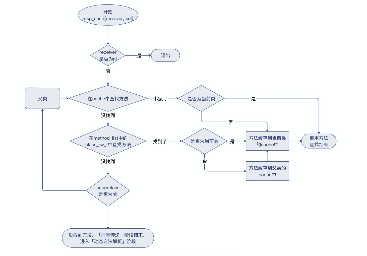 1)首先会经过「消息传递」阶段,会先在对象所在类/元类中的cache中查找方法,如未找到则在method_list中查找,还未找到则根据superclass指针在父类中重复查找;
