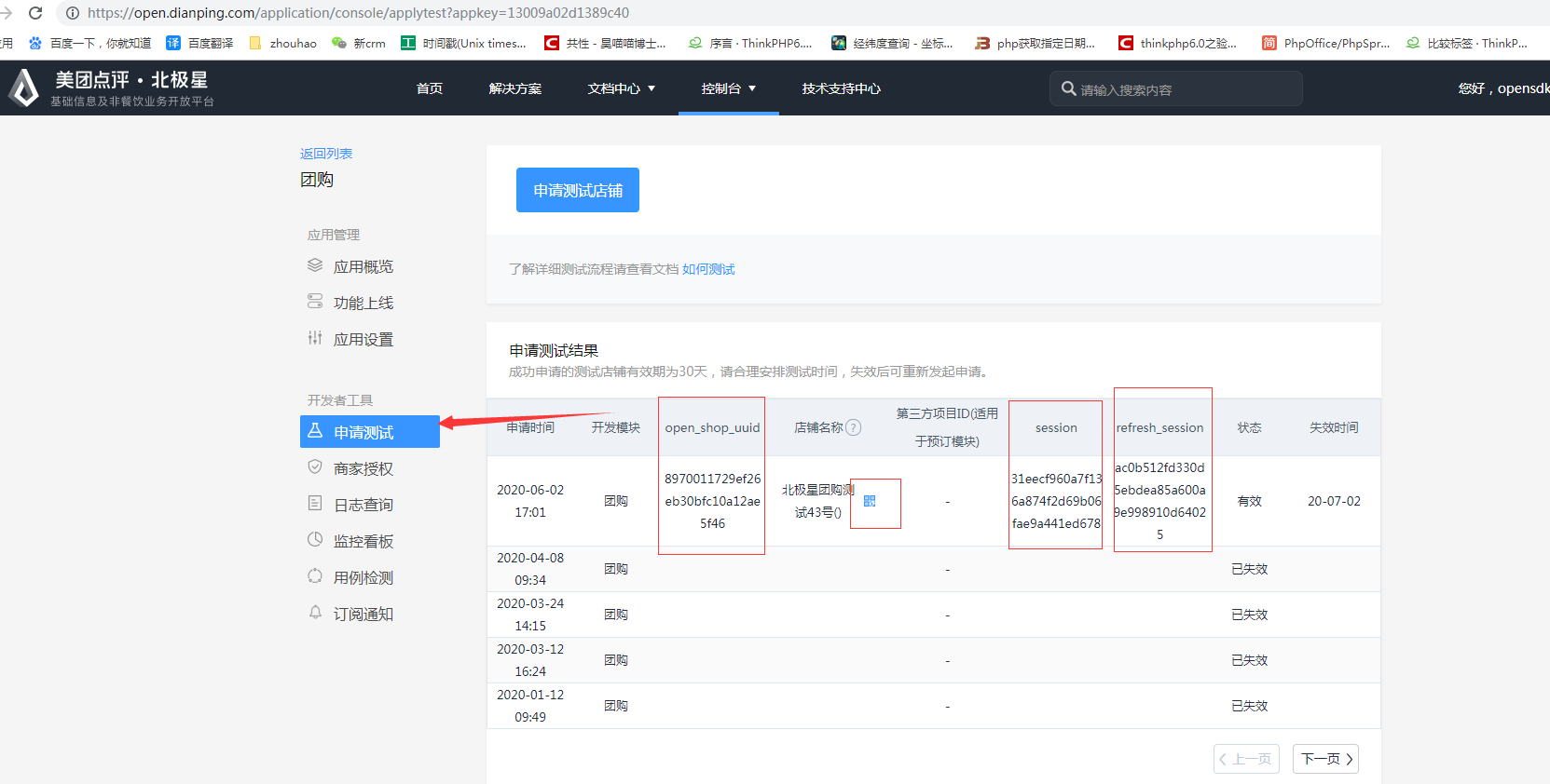 * 测试session 【 https://open.dianping.com/application/console/applytest?appkey=13009a02d1389c40 】