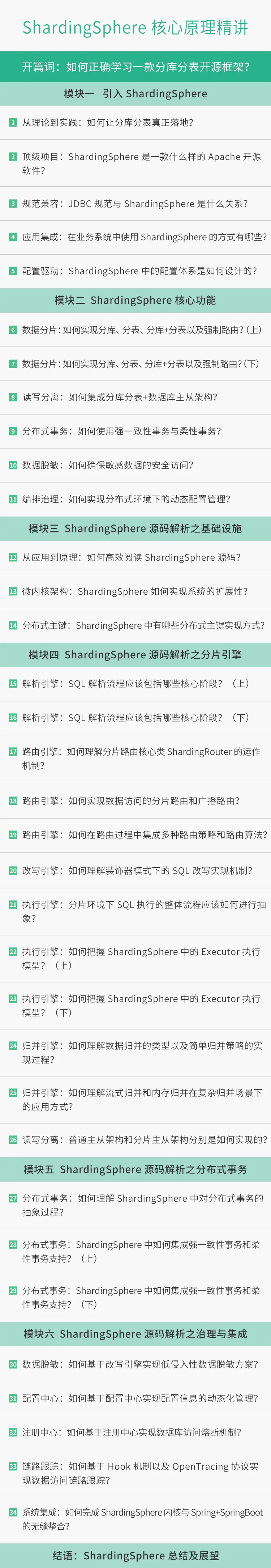 本专栏共 6 大模块,34讲内容,为你介绍主流分库分表解决方案和工程实践,带你掌握 ShardingSphere 核心功能和实现原理,基于 ShardingSphere 开源框架源码剖析,提高通用底层原理的理解力,提升实际场景开发能力。