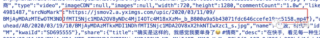 从快手App拿到视频分享链接在浏览器中访问,比如地址 f.kuaishou.com/1mqmxe 然后会重定向,打开浏览器控制台点击左上角的手机图片,刷新模拟手机请求,观察控制台源码可以看到下面的一段代码里包含一个srcNoWark字段的MP4视频地址,提取出来在浏览器中访问可以看到视频是污水印的。