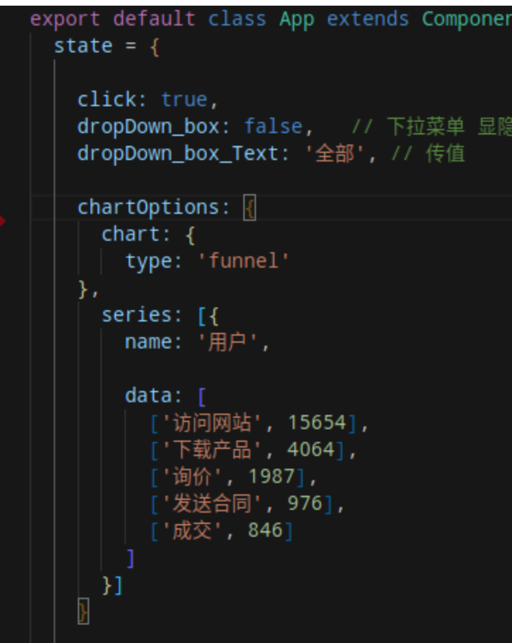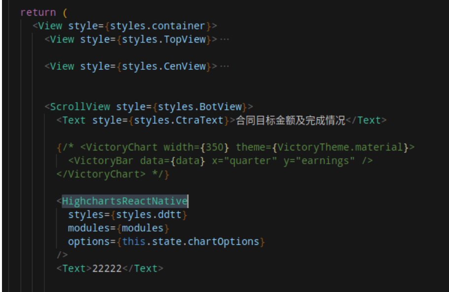 Rn引用HighCharts实现图表步骤 送你一个undfinded 2020-06-18 330 阅读1分钟 引入Highcharts需要的依赖项 需要命名一个常量modules里面放我们需要用的图表类型这里用的funnel是漏斗图类型 在state中放置图表需要用到的数据和类型 在HighchartsReactNative组件中添加modules属性