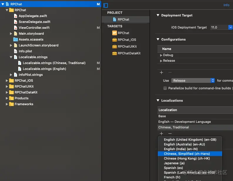 点击到Localizable.strings文件,点击右侧Localize...按钮添加需要国际化的语言。