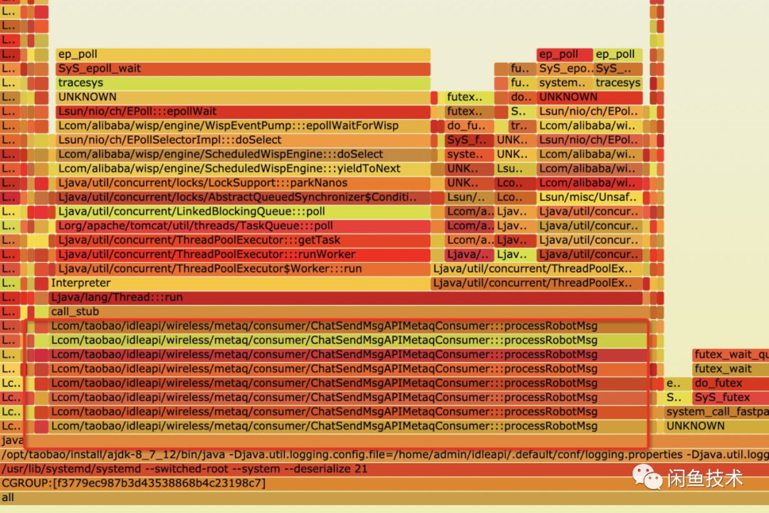 考虑到大部分实例业务日志打印缓慢或者根本不再打印,可能原因是io方面出了问题,通过查看容器硬件监控及应用火焰图,可以轻松将IO问题排除。