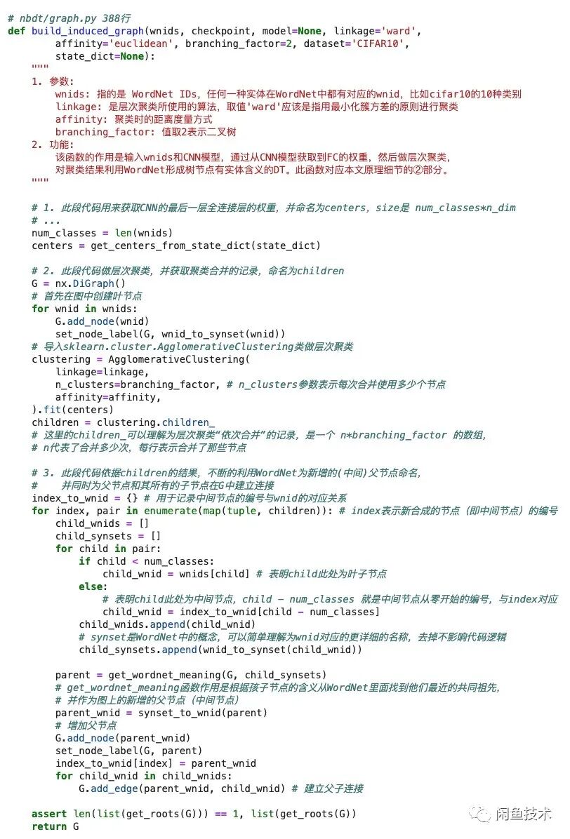 生成诱导层级核心函数为buildinducedgraph,其作用是输入叶节点的WordNet ID和CNN模型,通过从CNN模型获取到FC的权重,然后做层次聚类,利用WordNet对聚类结果“命名”,形成树节点有实体含义的DT。此函数对应本文原理细节的②部分。详细解释如下: