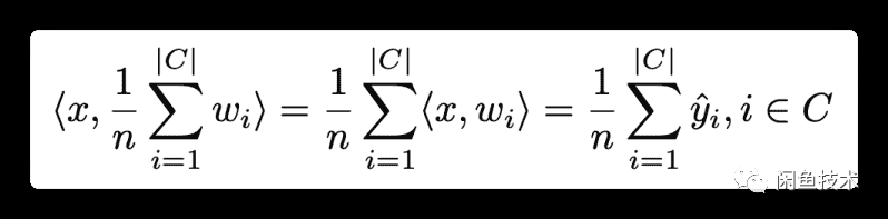 前面提到新样本进来后会先经过CNN,在FC之前会输出d维向量x,然后x与DT的各个节点的隐向量做内积,而各节点的隐向量又等于其子节点隐向量的均值。getnodelogits方法在这里做了一个优化:考虑到向量均值的内积等于向量内积的均值(如下图公式),因此不必显示的去求隐向量再做内积,而是对某个节点,直接把其子节点的logits求均值作为它本身的logits。具体代码如下: