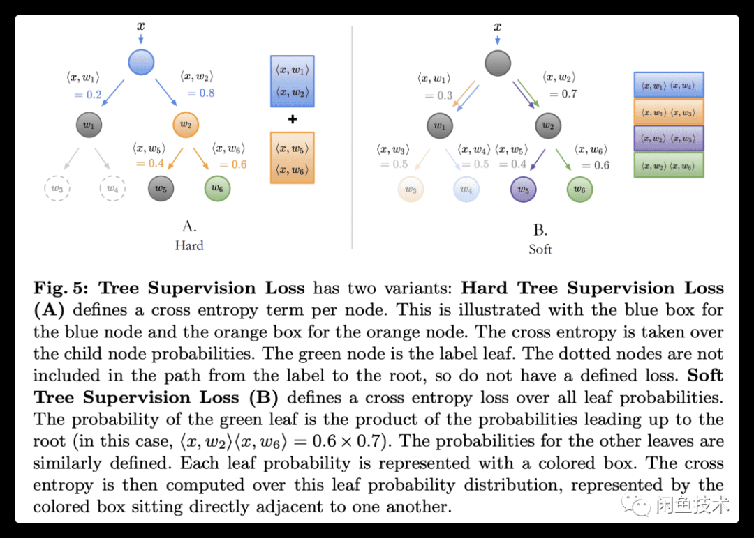 在理解了完整模型预测的细节之后,就可以来解释“诱导层级(树结构)的分类损失”。相对应的,损失函数同样有“Hard”和“Soft”两种模式,如下图所示。若是Hard模式的损失,那么Loss只会累加样本所属叶节点在DT中真实路径上的每个节点的分类损失(以一定权重),非真实路径(下图A虚线节点w3/w4)则不会计入,此处每个节点的分类损失使用交叉熵计算。若是Soft模式的损失,则是直接计算叶节点上的最终概率分布与真实onehot分布的交叉熵作为Loss。简言之,Hard模式损失函数计算的是“路径交叉熵”,Soft模式则计算的是“叶节点交叉熵”。在pytorch中的交叉熵计算方式为:
