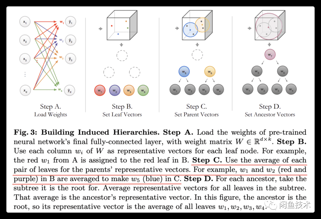 针对问题(1),作者使用了WordNet,一种包含名词之间上下位关系的词网络,python里面可以直接在nltk模块中导入wordnet模块调用。由于叶节点是存在实体描述的,比方说cifar10的10个类别,那么通过WordNet,可以找到两个叶节点“最邻近的共同祖先”,e.g. “猫”和“狗”在WordNet中可能最近的归属是都位于“哺乳动物”下,那么“哺乳动物”就被作为“猫”和“狗”的父节点。因此,可以按照层次聚类的结果,自底向上依次为父节点“命名”,直到只有一个根节点,这就形成了所谓的“诱导层级”,即下图中的“Step 1”。这个诱导层级也就是上面狗狗图片中的决策树。