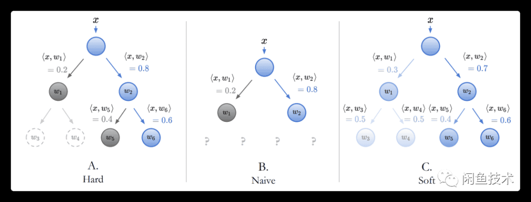 这里首先要理解完整模型预测所采用的方式,我认为作者在这里的思路是非常之精髓的。一个新的样本(一张图片)进来,首先要经过前面的CNN,在最后一层的全连接层W之前,CNN给该图片输出的是一个d维向量x。将x与W做矩阵乘法(实质上是与各列向量做内积),即得到该样本在各个类别的logits分布,如果再softmax则得到了概率分布。由于W的各列向量代表着DT叶节点的隐向量,那么完全可以用该DT来替换W,不再直接把x与W做矩阵乘法,而是从DT的根节点开始遍历,让x依次与DT各节点的子节点隐向量计算内积。这里遍历DT各节点有两种模式:“Hard”和“Soft”。以DT是二叉树为例,若是Hard模式,那么每次x会与左右两边的子节点分别算内积,哪边大就把x归为哪一边,一直计算到叶节点为止,最后x落到的叶节点,即为x所属的最终类别。若是Soft模式,则x会自顶向下遍历全部中间节点并计算内积,然后叶节点的最终概率是到达叶节点的路径上各中间节点的概率之乘积,最后通过比较各叶节点上的最终概率值的大小,即可确定x所属类别。