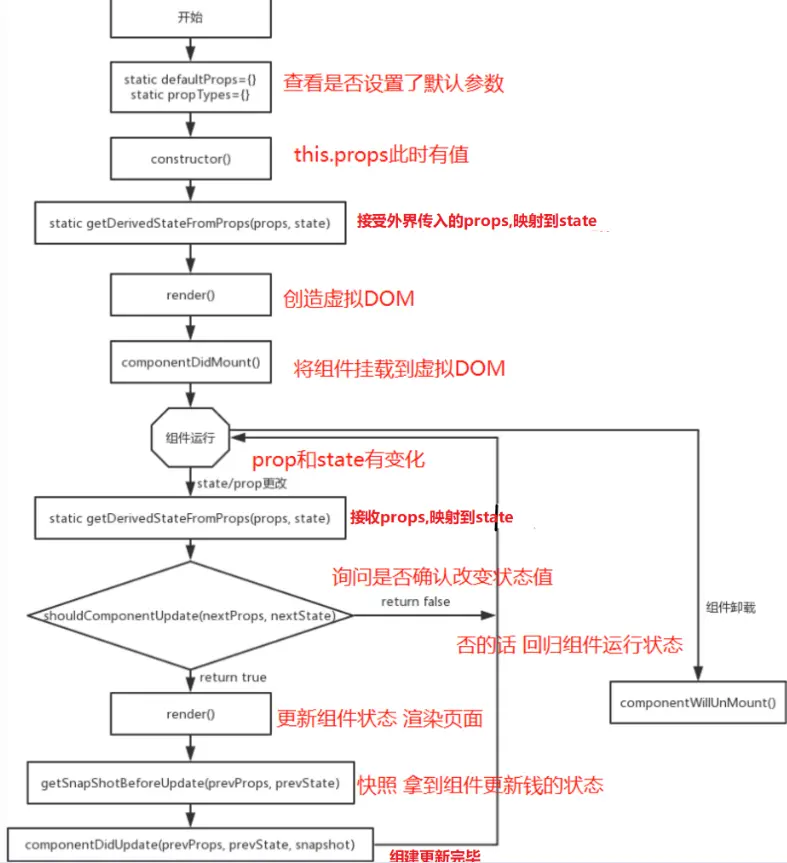 - 接收父组件传递过来的 props 和组件之前的状态,此生命周期钩子必须有返回值,返回值将作为第三个参数传递给componentDidUpdate。必须和 componentDidUpdate 一起使用,否则会报错