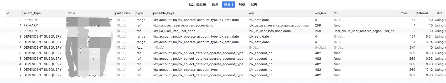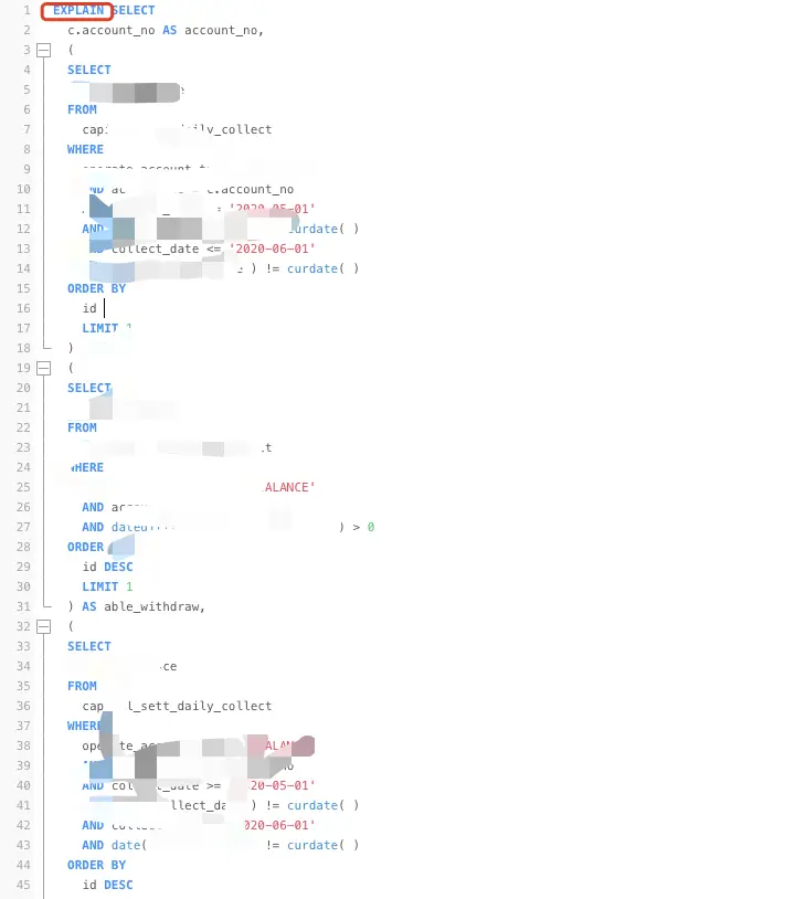 当然,这些都是些基础sql,遇到一些比较复杂的sql语句,怎么优化呢,这就要用到Explain执行计划了,先来看下举例吧(这条sql语句很复杂,是现在公司用到的,所以打个码,不好意思哈):