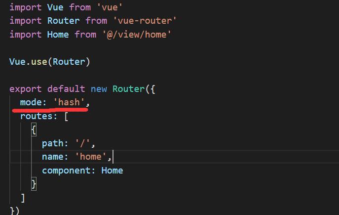 第五步:router/index.js路由模式一定要设置一个 不要不写 虽然默认的是 mode:'hash' 但不写的话会造成访问时出现空白页面 一定要写上 写上 history模式会消除 访问时 路径是出现个#的情况 默认的hash模式会有# ,找到目录src/router/index.js 修改成如下图所示: