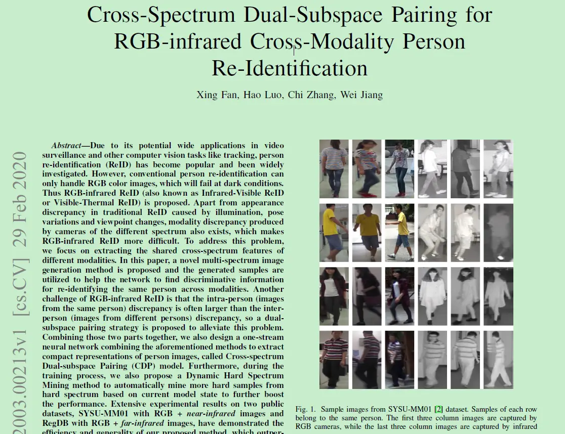 [1] Fan X, Luo H, Zhang C, et al. Cross-Spectrum Dual-Subspace Pairing for RGB-infrared Cross-Modality Person Re-Identification[J]. arXiv preprint arXiv:2003.00213, 2020.