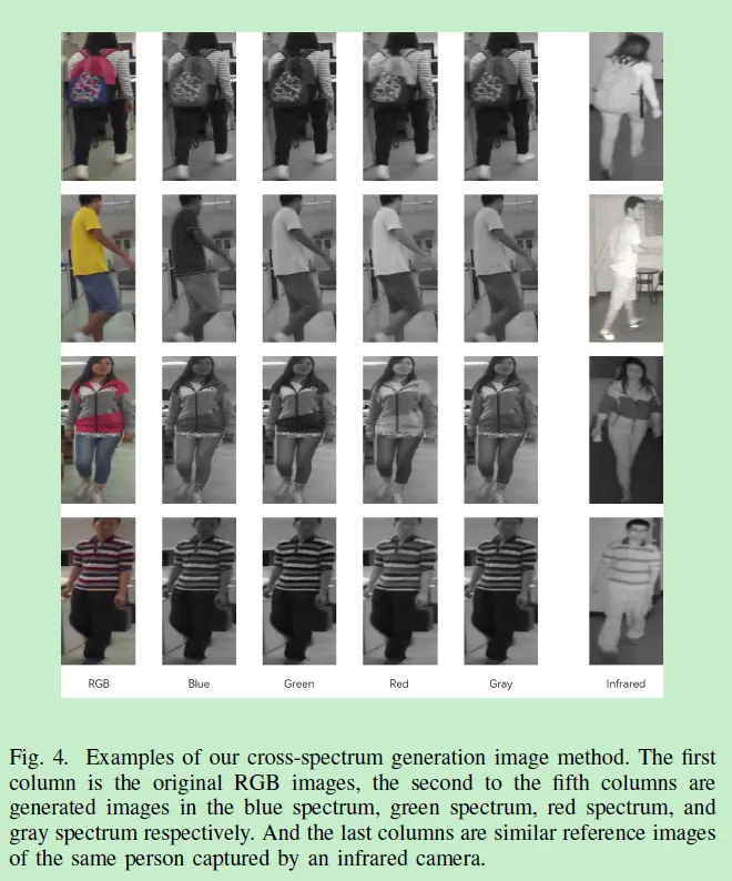 作者为了提取共享的跨模态特征来解决模态偏差,提出了跨光谱图像生成Cross-Spectrum Image Generation(CSIG),来生成多光谱的图像。如下图Fig. 4。