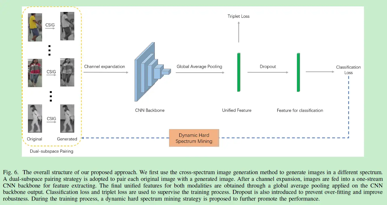文章[1]针对跨模态(红外)行人重识别,提出了跨光谱图像生成Cross-Spectrum Image Generation(CSIG)方法来生成多种光谱的图像,提出了双子空间配对策略(Dual-subspace Pairing Strateg)利用生成的光谱图像解决在红外模式下类内距离大于类间距离的问题。这两种方法的结合称之为跨光谱双子空间配对模型-Cross-spectrum Dual-subspace Pairing (CDP) model。作者还提出了动态难光谱挖掘-Dynamic Hard Spectrum Mining方法来优化跨光谱生成的随机性策略,使之更偏向于生成难训练的样本。