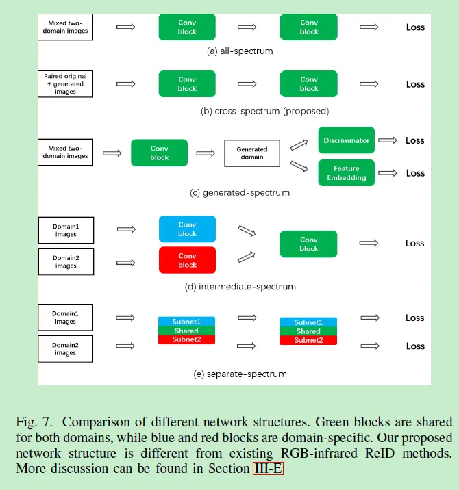 作者发现直接对生成的光谱图像使用triplet hard loss是很难收敛的,所以如Fig. 6所示,作者只对原图像进行triplet hard mining,根据网络流程我们可以知道作者使用了经典的classification loss + triplet hard loss模式: