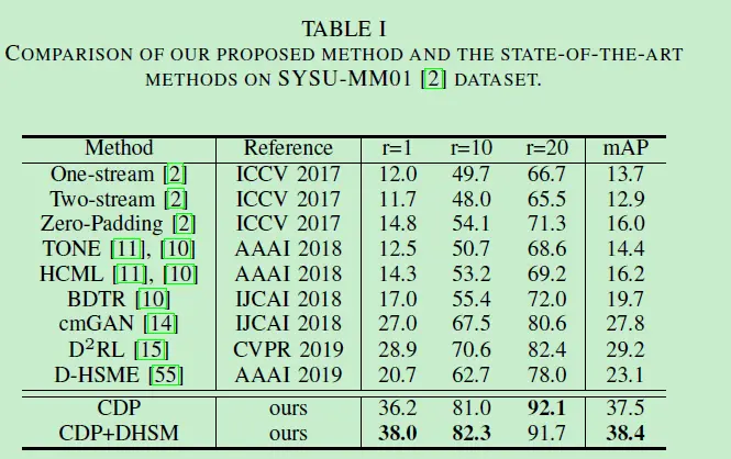 注意DHSM是动态难光谱挖掘(Dynamic Hard Spectrum Mining),CDP是结合了跨光谱图像生成方法(Cross-spectrum Image Generation)和双子空间配对策略(Dual-subspace Pairing Strategy)的总方法,Cross-spectrum Dual-subspace Pairing。