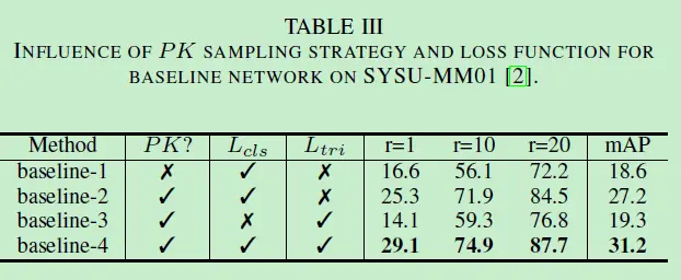 其中P是一个batch中拥有的行人的数量,K是一个batch中单个行人所拥有的图片数。可以看到baseline4是效果最好的。
