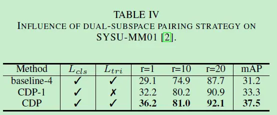 可以看到如果是普通的ReID模型,在Martket上不会错分类,但SYSU-MM01数据集上就容易错分类。为了解决这个问题文章提出了Dual-subspace Pairing Strategy,将原图像和生成的多光谱图像一起加入训练,提高模型对不同光谱的辨别力。