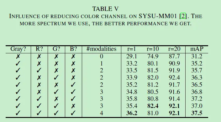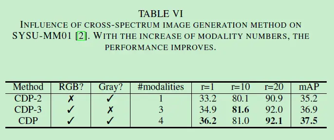 生成的图像可以看到,就一些诸如衣服颜色等特征已经跟红外图像相似了。作者认为引入这些不同模态的图像参与训练会提升网络的辨别力。