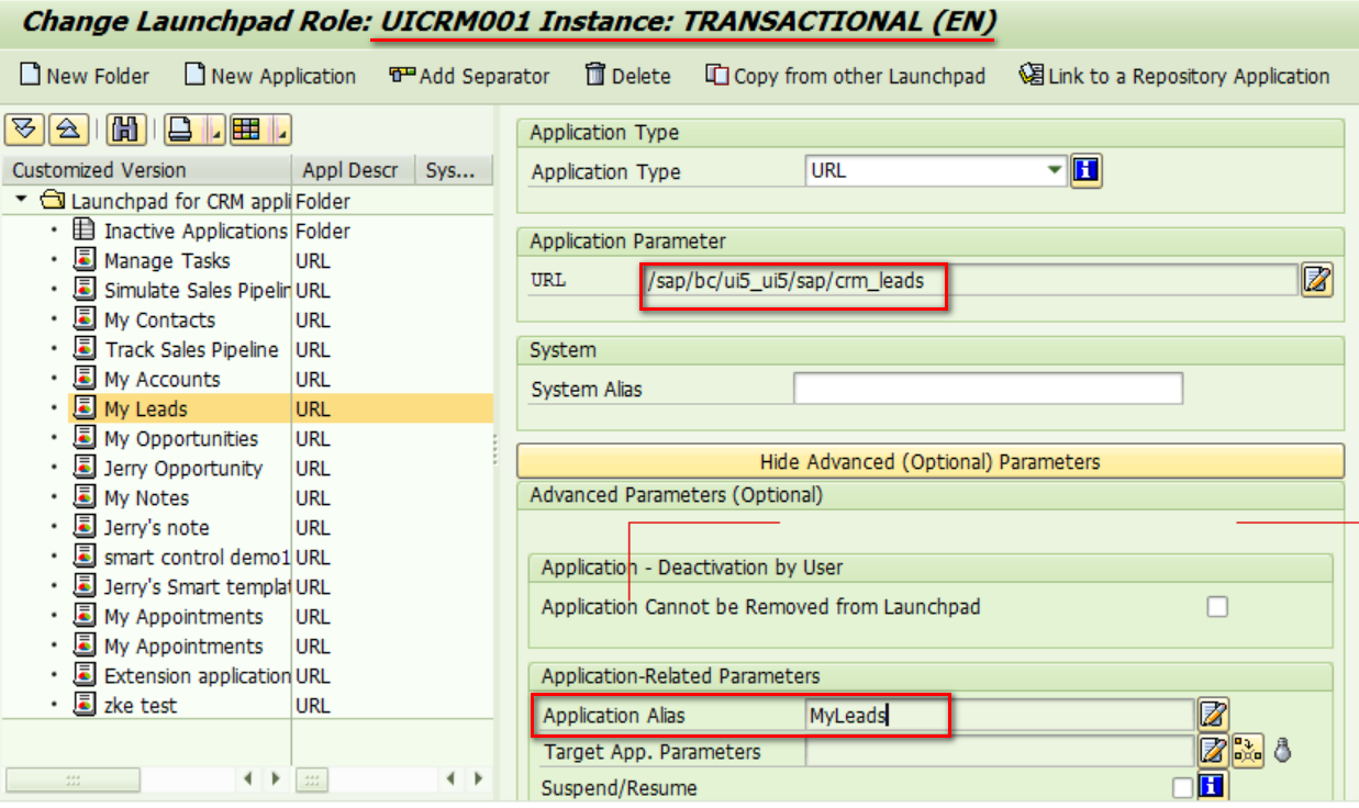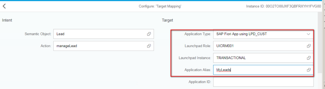 The combination of semantic object plus action used in my example leads to the target Fiori application with alias “MyLeads” in LPD_CUST.