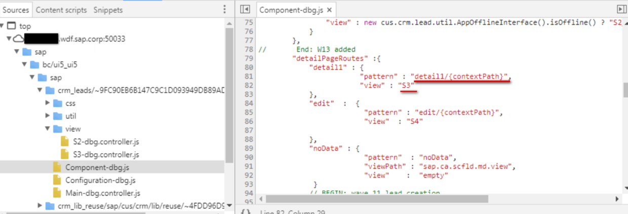 Open the Component.js of this application and the target view, S3, is configured for route pattern “detail1/{contextPath}”.