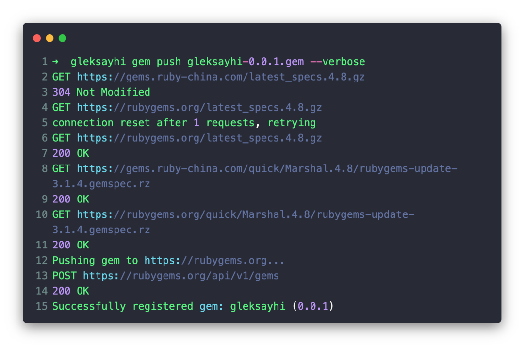 chmod 0600 ~/.gem/credentials现在你可以发布你的 gem 到 RubyGems.org,来分享你的 gem 了