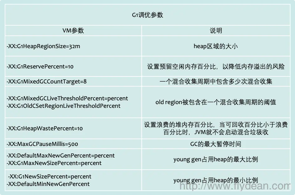 作为JDK9中的默认垃圾回收器G1,对G1的调优是必不可少的。下面是G1的参数: