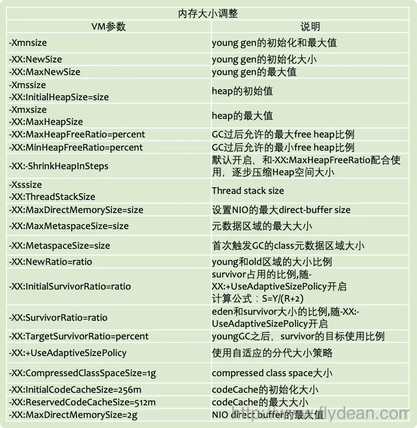 下面是JDK9中的内存调整参数: