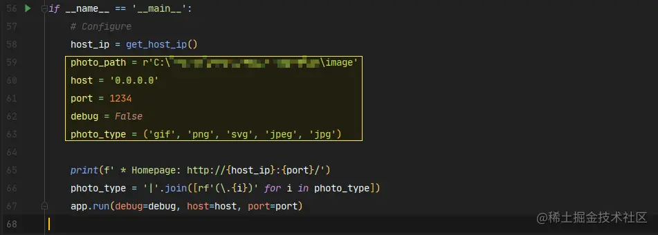 photo_path你需要共享/保存共享的图片文件夹路径host服务开启的访问模式,0.0.0.0会开启局域网访问,127.0.0.1将只开启本地访问port服务开启的端口号debugDebug 模式是否开启的布尔值photo_type图片格式白名单, 已忽略大小写, 使用的正则匹配