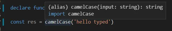 我们有时候引用npm 的第三方模块,但它不是使用TypeScript 编写的。例如我们引入lodash模块,调用camelCase ,如下可以看到这个方法没有类似限制的相关提示
