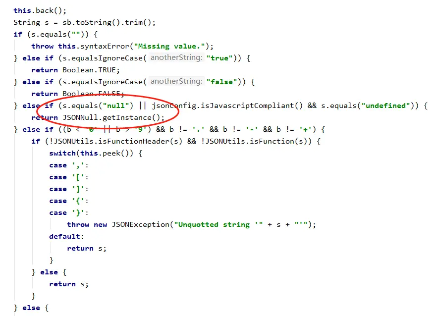 从 fromObject 方法加载 JSON 串开始源码深入分析,找到了这个神奇解析 null 值的源码: