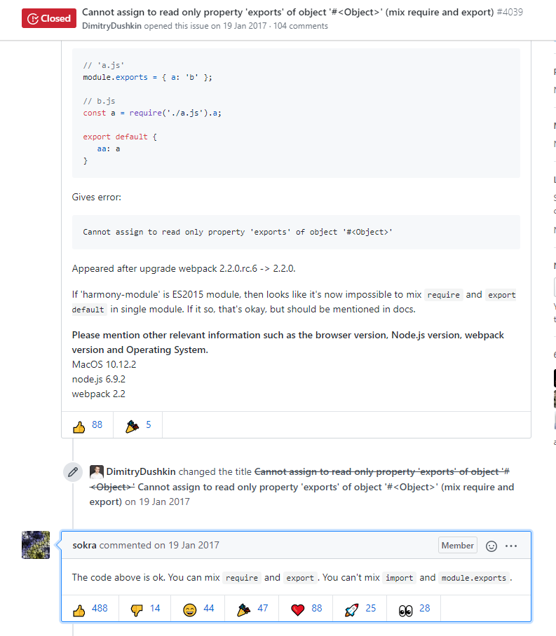 但是其实很久之前webpack官方就说过,支持require与export混用了,所以其实可能并不是这个错误 github.com/webpack/web…