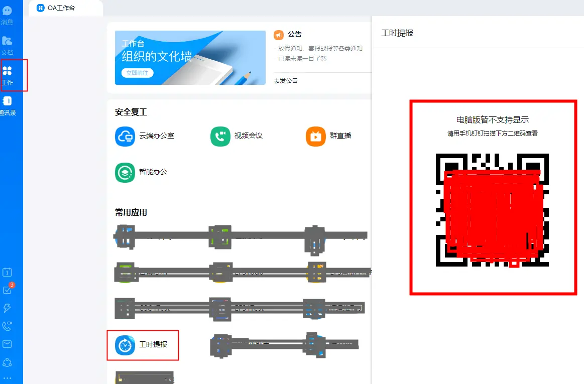 而钉钉PC端打开却是不行的(如下图),只会出现一个二维码,这个时候就需要做我们的钉钉企业内部H5微应用