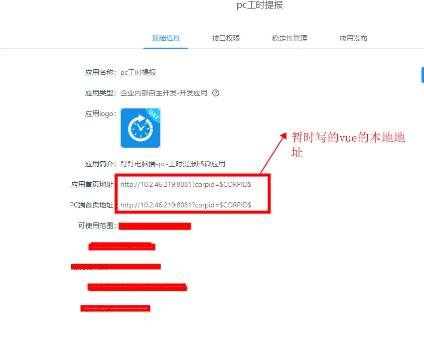 创建时基本信息(钉钉企业内部H5微应用是用vue改造的项目,Vue.js脚手架vue-cli3.0来搭建;图中应用首页地址和pc端首页地址上的端口号可以随时修改,随vue启动时的地址修改,后改成了8080端口,图未变):