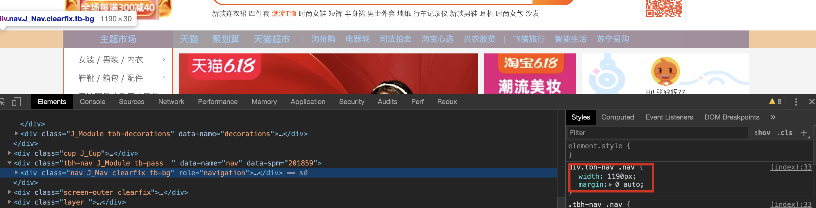 使用margin: 0 auto可以说是最常用的左右居中的方法,不仅适用于块级元素也适用于行内元素。很多网页的布局都是使用margin: 0 auto,例如淘宝pc端,如下图所示: