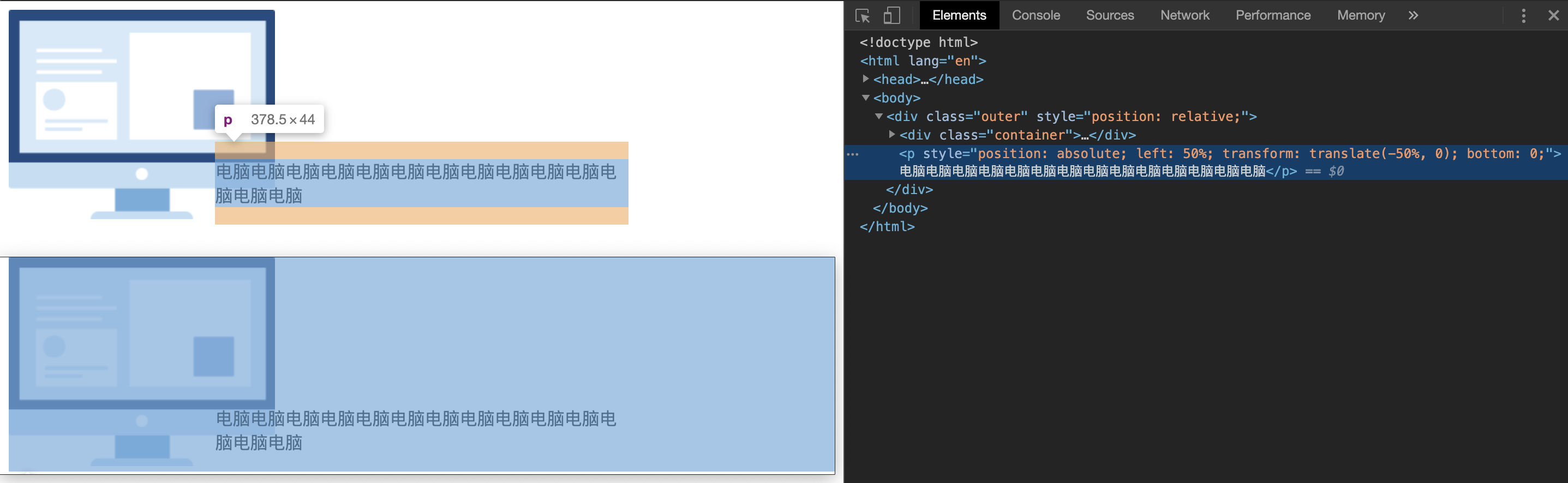 本来应该是一行显式的p元素却换行了,这是因为在一个relative元素里面的absolute定位的子元素会通过行内元素换行的方式,尽可能不超过容器的边界。由于设置left为50%,导致p元素超了边界,所以就换行了,即使再设置translate:-50%也已经晚了。