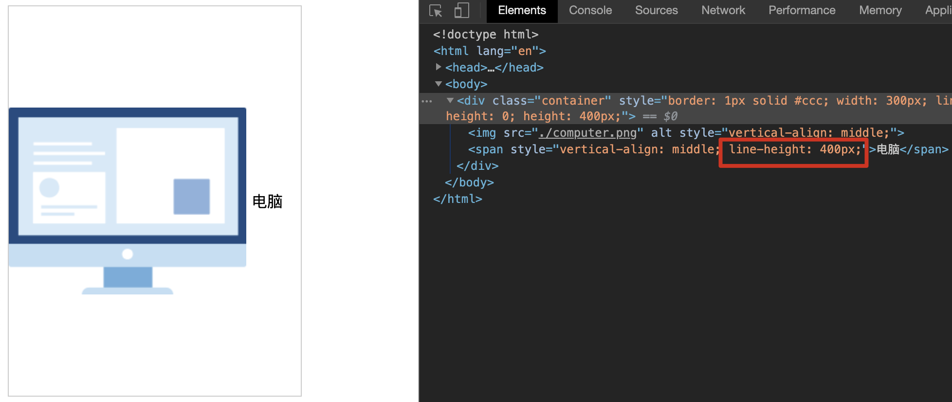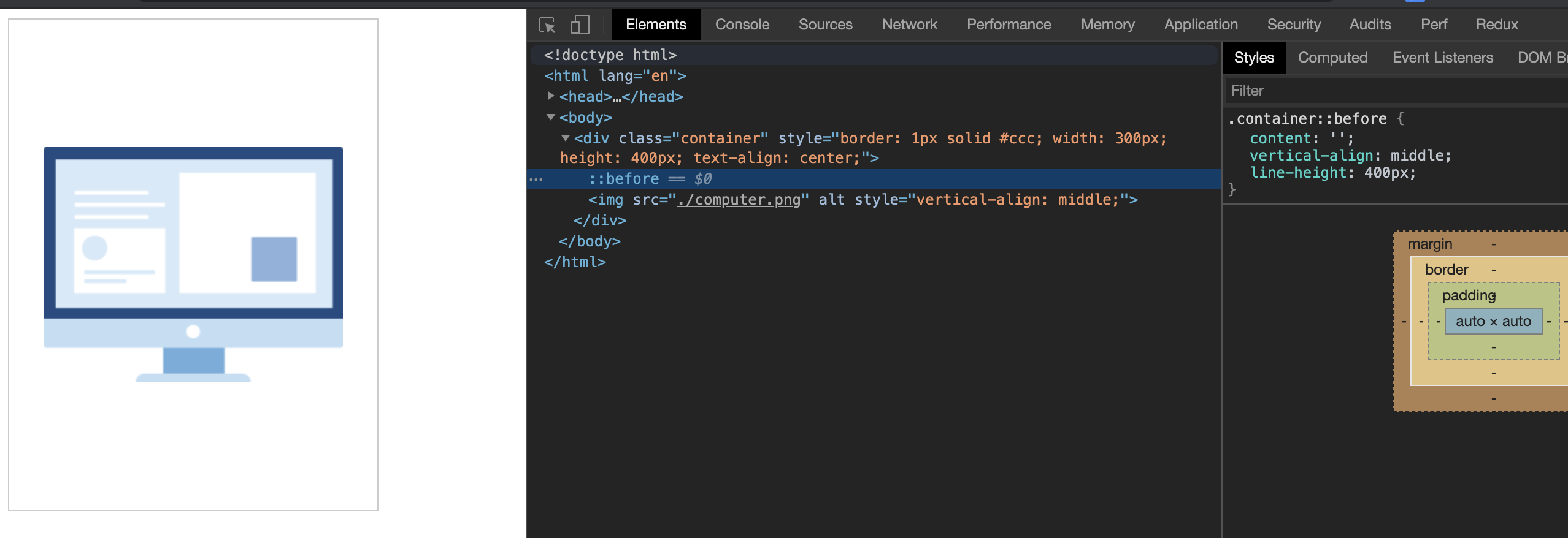也就是说,如果需要垂直居中一个div里的比div高度小的图片,可以添加一个元素,让它的line-height等于div的高度。下面使用伪元素::before来添加line-height。