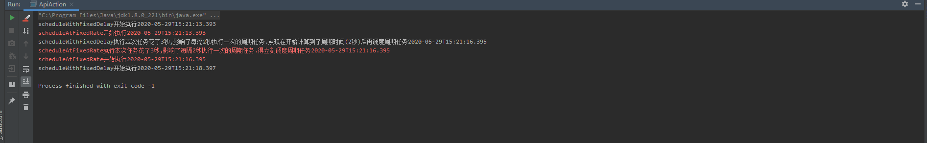 System.err.println("scheduleAtFixedRate执行本次任务花了3秒,影响了每隔2秒执行一次的周期任务.得立刻调度周期任务"+ LocalDateTime.now());
