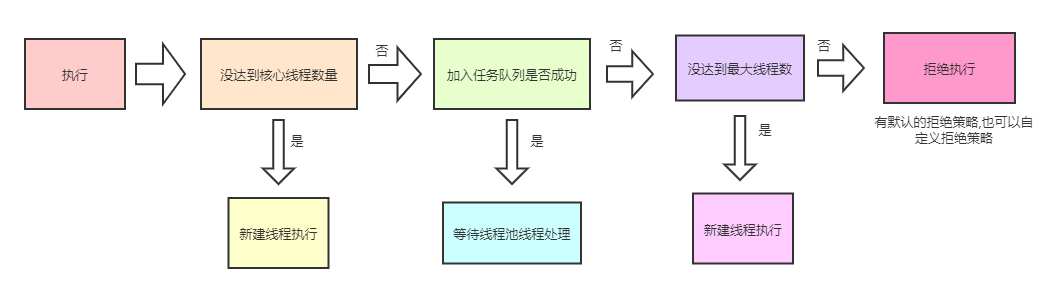 - 加入队列失败判断线程的存活数量是否小于最大线程数数量如果小于加开线程处理该任务,否则拒绝执行