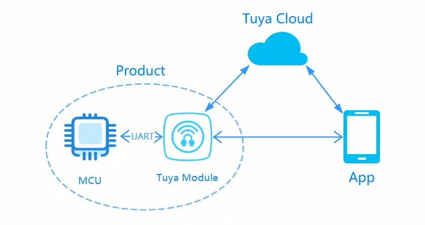 涂鸦联网模块:采用涂鸦通用MCU对接串口协议与MCU通讯,连接App和云端实现功能点指令上报下发。 涂鸦云:全球部署云服务,为客户提供安全、稳定、快速的涂鸦云服务。