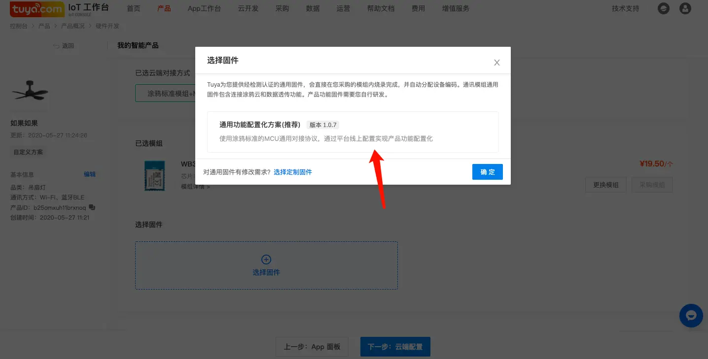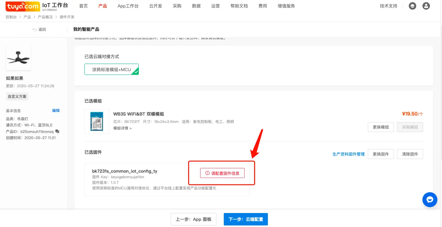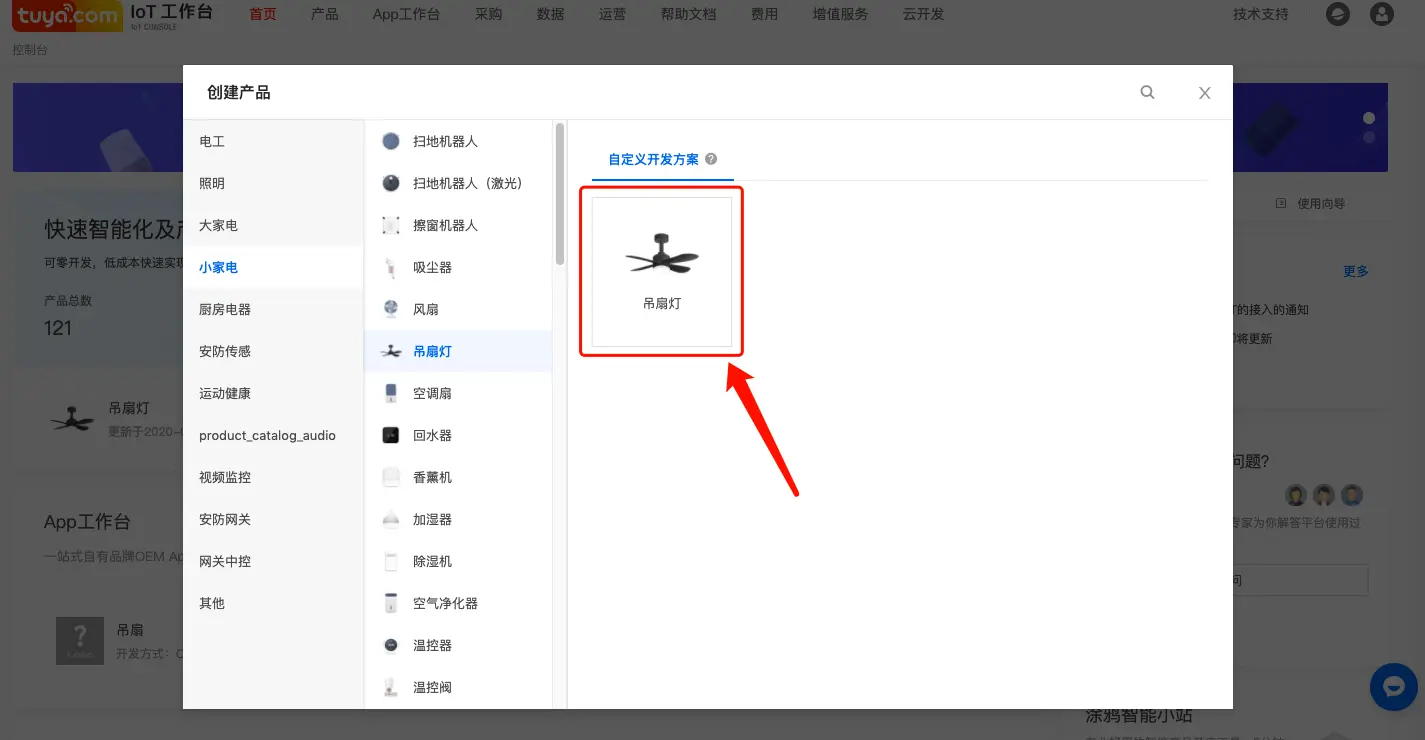 在涂鸦IoT平台创建产品,选择【小家电】-【吊扇灯】,点击“创建产品”即可开始创建产品。