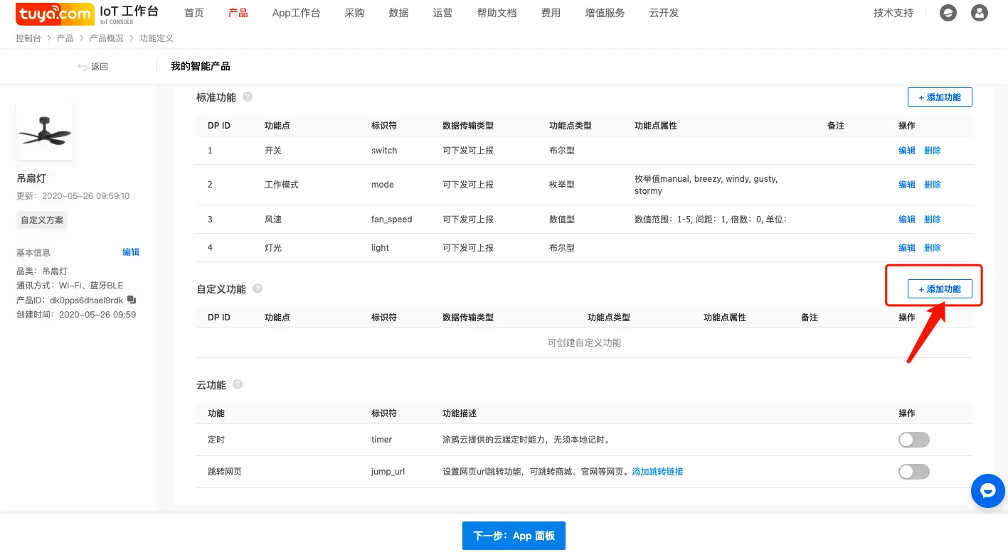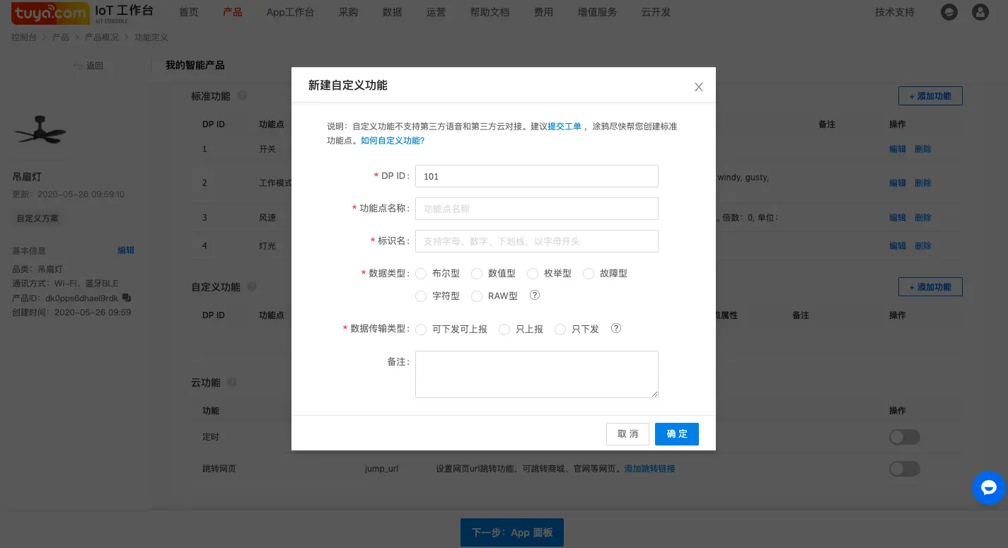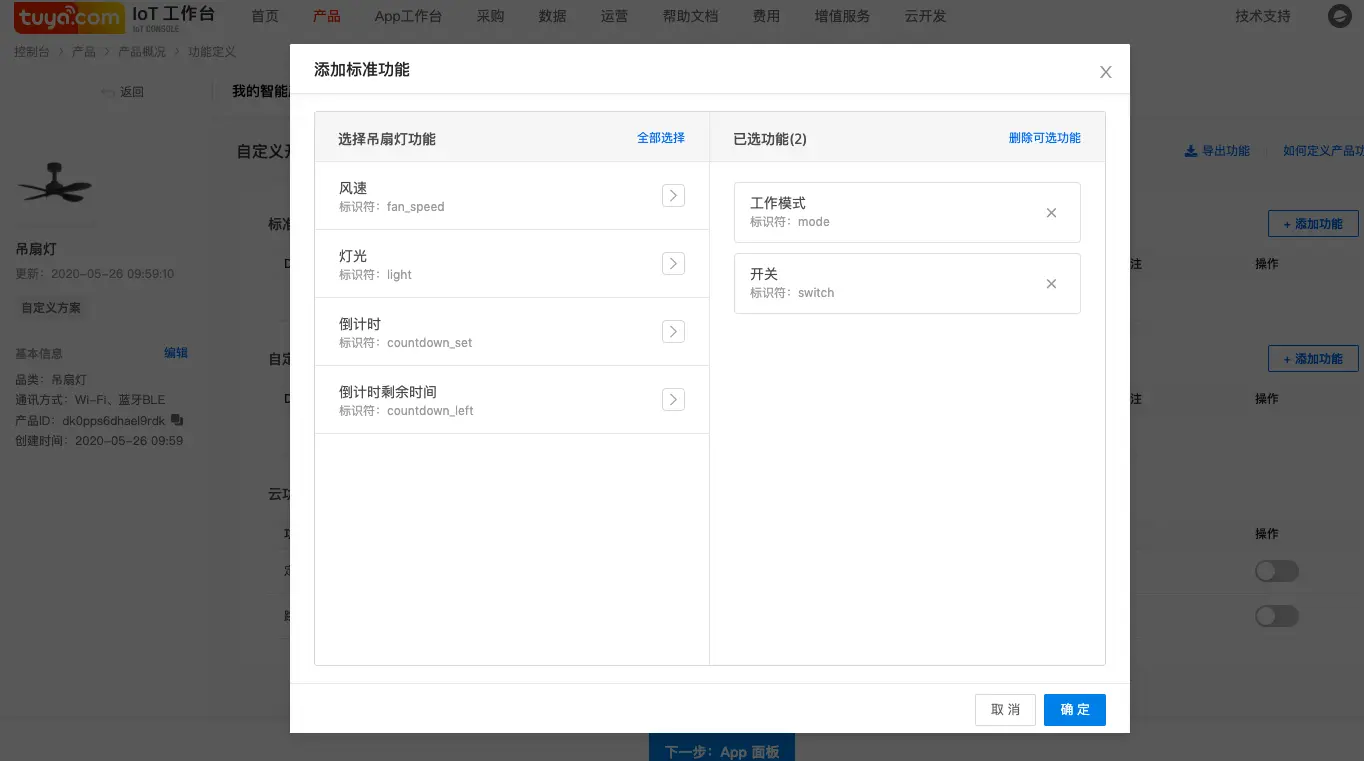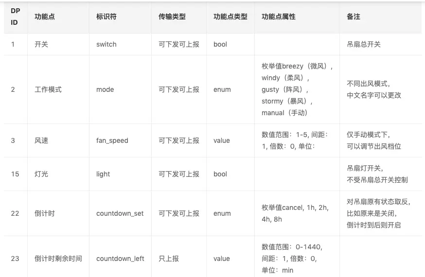 标准功能涵盖吊扇开关、吊扇灯开关、4种出风模式、1~5档风速调节,倒计时和倒计时剩余时间。同时,枚举型功能允许用户新增类型,如睡眠风等,数值型功能允许用户改变数值范围,工作状态,错误码等,新增后,App设备控制页会同步更新。