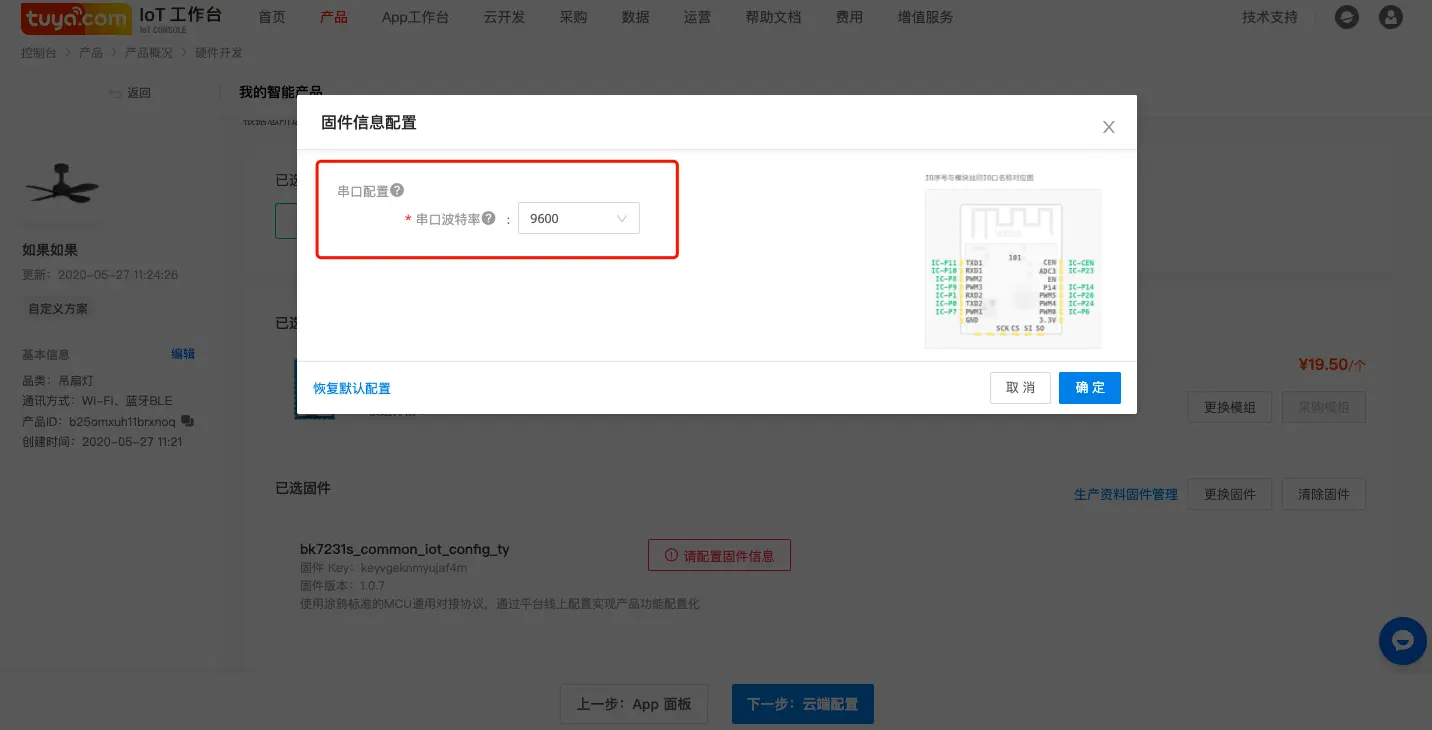 吊扇灯电控,主板通过云模组,与涂鸦云和App进行通讯连接。在产品新建后,选择适用的云模组,并根据主板、云模组的接口电路及产品要求,完成硬件电路的开发。