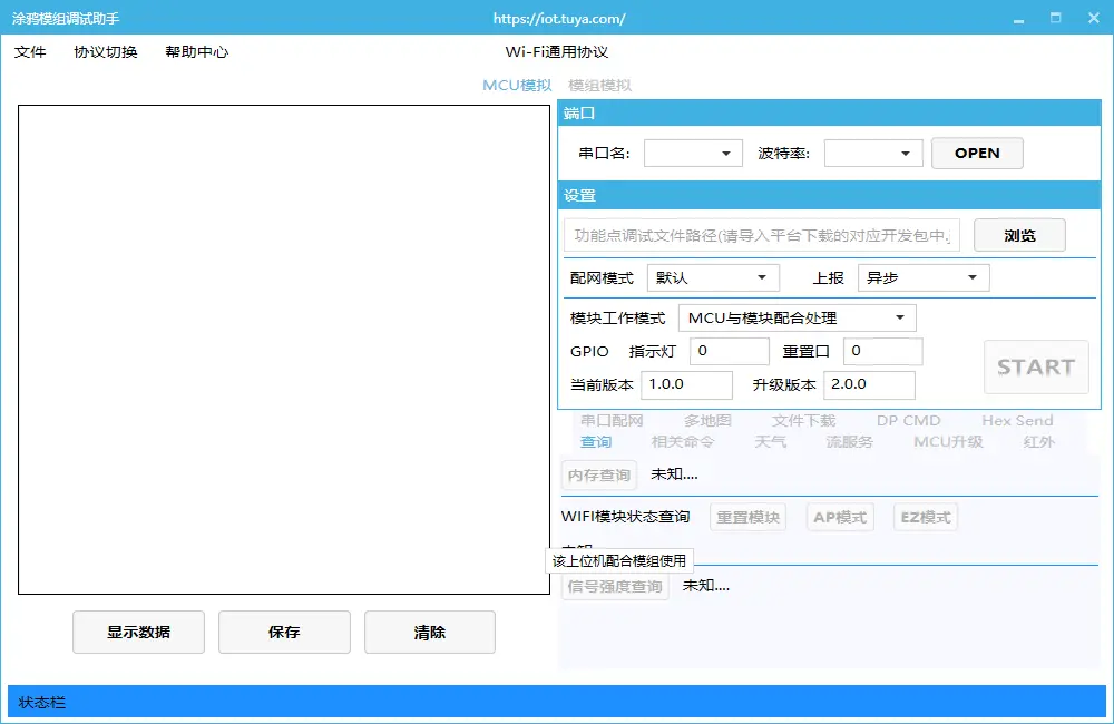 1、仿真助手 涂鸦云仿真助手,PC机与云模组通过串口连接,模拟MCU收发机器功能DP数据,可在App端实时体验交互效果。