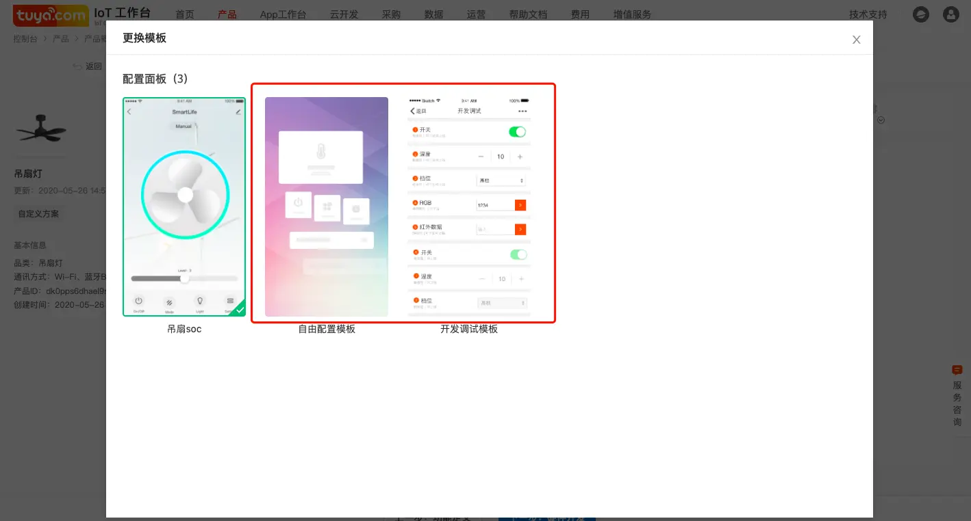产品定义后,可以选择不同风格的面板(设备控制页),作为吊扇灯的交互页面。在IoT平台,提供公版面板、自由配置面板,以及开发调试面板,供用户选择。